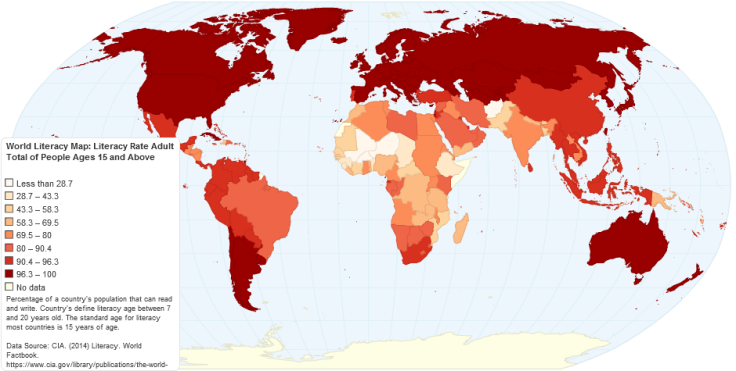 My 10 year-old daughter was looking in our atlas a while back (yes, she is my daughter) and in the encyclopedic entry of each country she started noticing that literacy rates were included. She started asking about which regions had higher and lower literacy rates. This became a teaching moment about the power of the map–I explained that all this data can be more easily accessed and seen on a map and this interactive map is what we discovered. We need to help student find the maps and data to answer their questions (and we need to make sure that they are curious enough to ask questions about the way the world works).