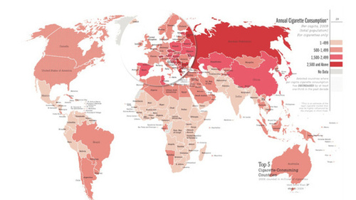 Between 1990 and 2009, cigarette consumption in regions of the world like Western Europe dropped by more than 25% – but that is only one side of the coin. Historically, cigarette consumtion has been a privilege to the rich and high-income countries. Now, with those countries understanding the risks of cancer and the dangers of smoking, the number of smokers decline. But in the past twenty years, for example, the use of cigarettes in the Middle East and Africe has increased by 60%: “Among the 14 countries where 50% or more of men smoke all but one country (Greece) are classified as low- or middle-income.”