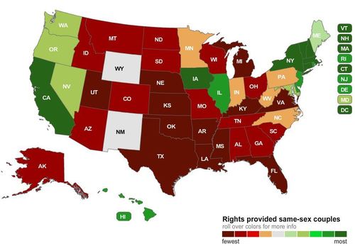 With President Obama announcing that he now supports the legalization of gay marriage and Gov. Romney reiterated the GOP stance that marriage should be between a man and a woman, this sets the stage for a ‘culture war’ to be at the center of the 2012 election. While communities, churches and families may be split on this topic, there are some strong regional patterns that (given the electoral college) will have important political ramifications. As Jennifer Mapes stated about this interactive map, “it’s useful in showing the geographic polarization of the country (coasts/center; urban/rural) as states strengthen laws that either allow for or restrict gay marriage/civil unions over the past ten years.”