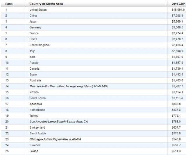 This WSJ article shows the economic strength of numerous greater metropolitan regions in the United States. Even more important than the article is the “Interactive Graphics” which presents the tabular data of the top countries by GDP interlaced with U.S. metro area’s GDPs. Amazingly, 11 metropolitan areas (if they were independent countries) would rank in the top 50 countries of the world based on total GDP.