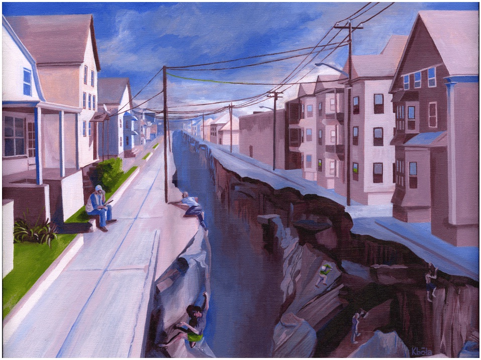 While touring Kevin Babola’s art studio yesterday, I found this thought-provoking piece entitled ‘Political Landscapes.’ I greatly enjoyed my conversation with the artist about the political, economic and urban visions that went into this painting. The conceptual idea behind this painting started when the artist was exploring the neighborhoods of New Bedford, MA and noticed how a sense of place can change very quickly. I dare say most cities have areas similar to the one portrayed here where the socioeconomic character changes very abruptly. While physically it might be very easy to cross from the side of the street with tenements to the neighborhood with single family homes, making that transition permanent is incredibly difficult.