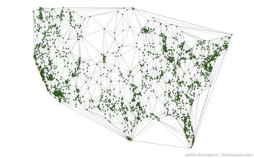 The green dots on this map representing Starbucks locations which are obviously clustered in major metropolitan centers. Cross-referencing this Starbucks address location with population data, Davenport explains his mapping technique: “By counting the number of people who live within a given distance to each Starbucks, we can measure how well centered Frappuccinos are to the US citizenry. In other words: draw a 1-mile circle around every store, then add up the % of the population living within the circles. Repeat for 2, 3, 4….100 miles.” The result of this data is a fabulous logrithmic S-curve which explains much about the American population distribution.