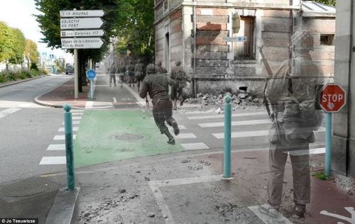 The remarkable pictures show scenes from France today with atmospheric photographs taken in the same place during the war superimposed on top.