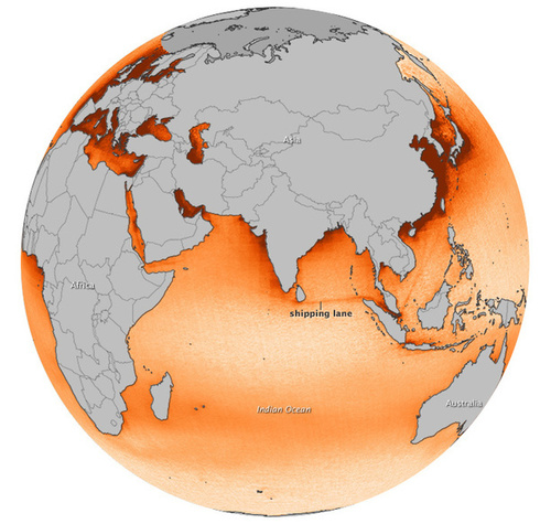 Elevated levels of nitrogen dioxide pop out over certain shipping lanes in observations made by the Aura satellite between 2005-2012. The signal was the strongest over the northeastern Indian Ocean.