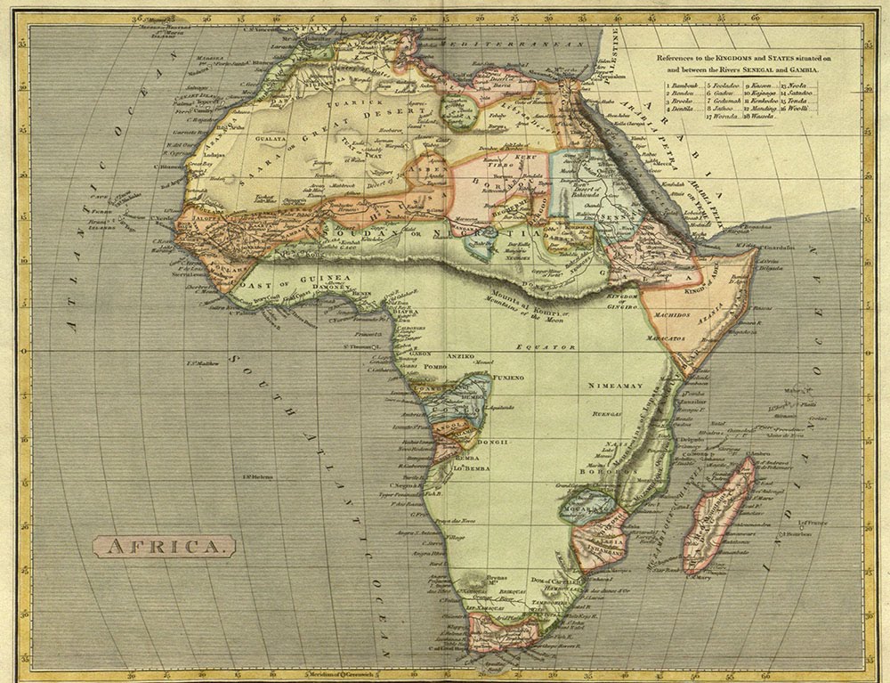 This fabulous collection of African maps from 1535-1897 represents an historical geographic vision of both Africa and colonial vision of Africa. I chose this particular map to display because it beautifully highlights the Mountains of Kong. For generations, European cartographers erroneously believed that this long mountain range extended north of the West African coast and across the continent. Currently this map collection is at Plymouth State, NH, but much of it is archive online here.