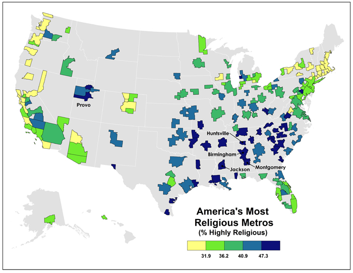 The majority of the most religious metros are concentrated in the South or Utah. The particular weekend, many of the rythmns of urban life in Utah cities are remarkably visible as the LDS church holds it’s semi-annual General Conference. On the opposite side of spectrum, 5 of the 10 least religious metros are in New England; the west coast is the other center of diminished religiosity (with a mini-center in Colorado).