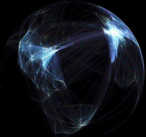 This set of 9 images displays 58,000 flight paths from various perspectives. What patterns do you see emerging from as you are able to visualize this data? What does this tell you about the world today?