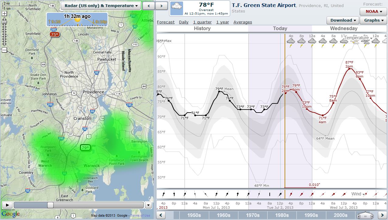 Weather Spark is a platform with interactive maps, weather forecasting and climatological history for the last five years for many different weather stations. This is the data for the TF Green airport, and is an incredible set of information to teach physical geography.