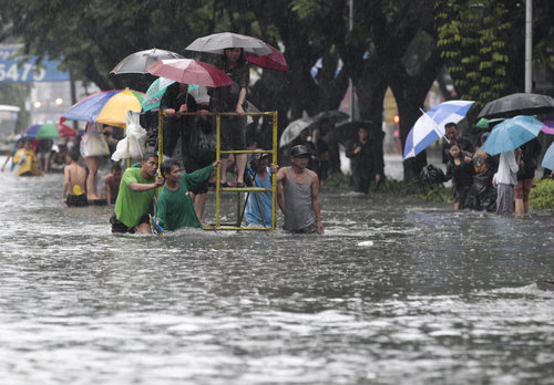 “Flooding caused by some of the Philippines’ heaviest rains on record submerged more than half the capital Tuesday, turning roads into rivers and trapping tens of thousands of people in homes and shelters. The government suspended all work except rescues and disaster response for a second day.”