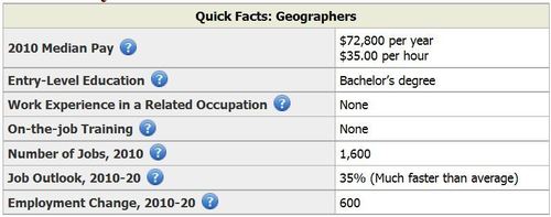 For those looking to justify the inclusion of geography in the curriculum, wanting to add a geography major at a school or need to justify the existence of geography education to a non-geo-evangelist, this is something to share. The Bureau of Labor Studies has declared “”Employment of geographers is expected to grow 35 percent from 2010 to 2020, much faster than the average for all occupations. Employment growth will be fastest in the professional, scientific, and technical services industry.”