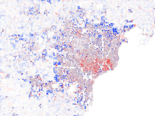 This series of maps shows important patterns impacting American cities today. Pictured above is Detroit, emblematic of urban decline, but some of the patterns that we see in Detroit are happening elsewhere in the United States (but not was pronounced). Three patterns are especially noteworthy: 1) Decline of the urban core, 2) Growth in the suburban ring but most especially 3) a revitalization of the downtown (specks of blue in the sea red).