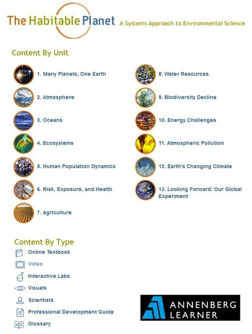 Much like the Power of Place resources were created by Annenberg Learner to share World Regional Geography videos, the Habitable Planet has diverse resources for Physical Geography and Environmental Science. In essence, it is an excellent free online textbook.