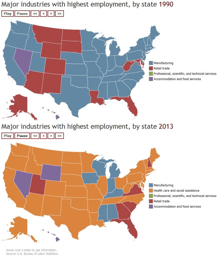 In 1990, the manufacturing industry was the leading employer in most U.S. states, followed by retail trade. In 2003, retail trade was the leading employer in a majority of states. By 2013, health care and social assistance was the dominant industry in 34 states. This animated map shows the top industry in each state and the District of Columbia from 1990 to 2013.
