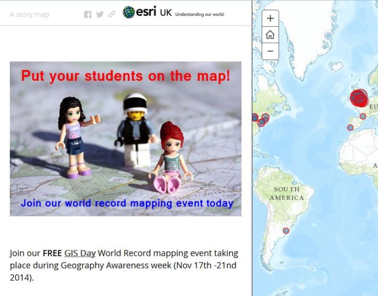 Join our FREE GIS Day World Record mapping event taking place during Geography Awareness week (Nov 17th -21nd 2014, video with more details). With a local to global perspective, we want students to map their thoughts and feeling about their local area.