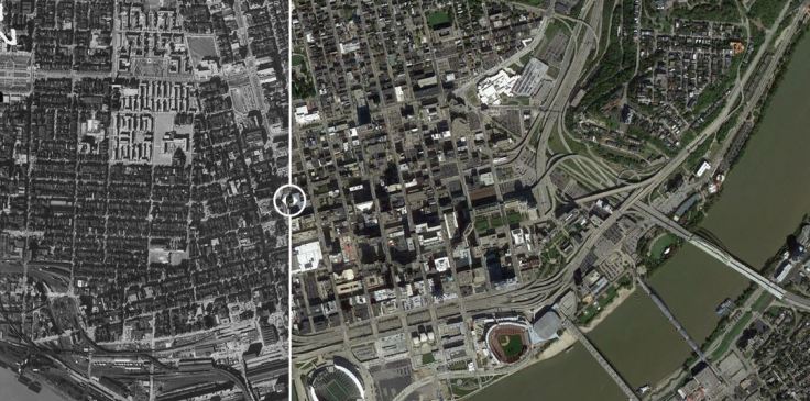 “60 years has made a big difference in the urban form of American cities. The most rapid change occurred during the mid-century urban renewal period that cleared large tracts of urban land for new highways, parking, and public facilities or housing projects. Fine-grained networks of streets and buildings on small lots were replaced with superblocks and megastructures. While the period did make way for impressive new projects in many cities, many of the scars are still unhealed. We put together these sliders to show how cities have changed over half a century. In this post, we look at Midwestern cities such as [pictured above] Cincinnati, Ohio.”