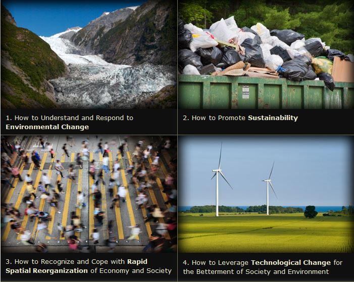 We are living in an era of receding glaciers, accelerating loss of species habitat, unprecedented population migration, growing inequalities within and between nations, rising concerns over resource depletion, and shifting patterns of interaction and identity. This website provides 11 geographic investigations aligned to the geographic questions in the NRC Understanding Our Changing Planet report. The report focuses on the future directions in the geographical sciences and how these key questions will guide research to help us understand the planet on which we live.