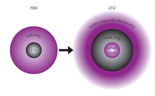 A new report tracks demographic trends across 66 U.S. metro areas. The report provides comprehensive evidence for Aaron Renn’s “new donut” model of cities (pictured in above image, on the right). Renn’s model proposes that city centers and outer-ring suburbs are doing well economically, but inner-ring suburbs are struggling with a new influx of poverty.”