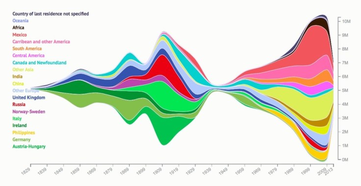 “Where have immigrants to the U.S. come from? Natalia Bronshtein, a professor and consultant who runs the blog Insightful Interaction, created this fascinating visualization of the number of immigrants to the U.S. since 1829 by country of origin. The graph hints at tragic events in world history. The first influx of Irish occurred during the potato famine in 1845, while the massive influx of Russians in the first decade of the 20th Century was driven by anti-Semitic violence of the Russian pogroms (riots). Meanwhile in the Austro-Hungarian Empire, army conscription and the forced assimilation of minority groups drove people to the U.S. in the early 1900s. Since WWII, Central and South America and Asia have replaced Europe as the largest source of immigrants to the U.S. Immigration shrunk to almost nothing as restrictions tightened during WWII, and then gradually expanded to reach its largest extent ever in the first decade of the 21st Century.”