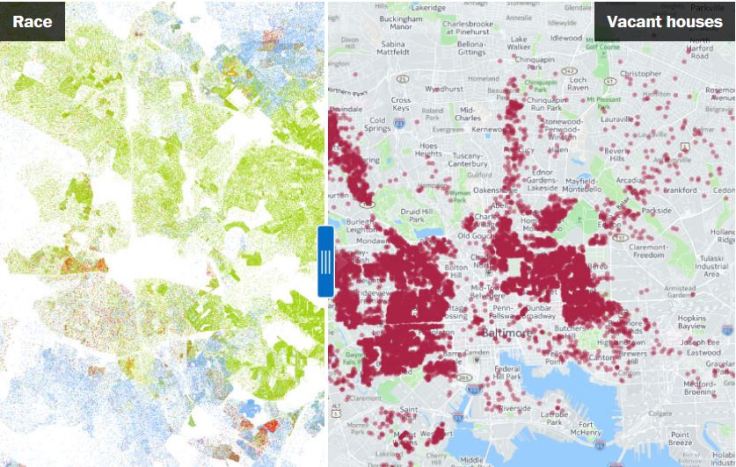 The map on the left shows one very tiny dot for each person living in Baltimore. White people are blue dots, blacks are green, Asians are red and Hispanics yellow.The map on the right shows the locations of Baltimore City’s 15,928 vacant buildings. Slide between the two maps and you’ll immediately notice that the wedge of white Baltimore, jutting down from the Northwest to the city center, is largely free of vacant buildings. But in the black neighborhoods on either side, empty buildings are endemic.
