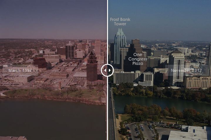 “Drag or swipe the slider to see how Austin’s downtown skyline has changed over time.”