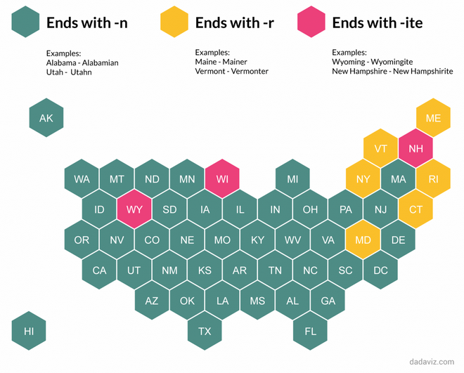 “For most states, you’re safe adding an –n, and maybe a few other letters, to the state’s name – a la Coloradans, Nebraskans and Californians. For three states, Wyoming, Wisconsin and New Hampshire, the correct method is to add an –ite. For a handful of states in the northeast, the style is to add an ‘r’ – New Yorker, Vermonter, Mainer, Marylander, Connecticuter and Rhode Islander.”