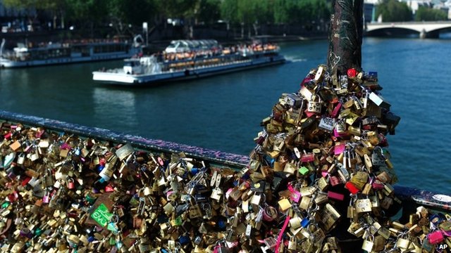 “The city of Paris will start removing padlocks from the Pont des Arts on Monday, effectively ending the tourist tradition of attaching ‘love locks’ to the bridge. For years, visitors have been attaching locks with sentimental messages to the bridge in symbolic acts of affection. Some further seal the deal by throwing keys into the Seine River below. It was considered charming at first, but the thrill wore off as sections of fencing on the Pont des Arts crumbled under the locks’ weight. The bridge carries more than 700,000 locks with an estimated combined weight roughly the same as 20 elephants.”