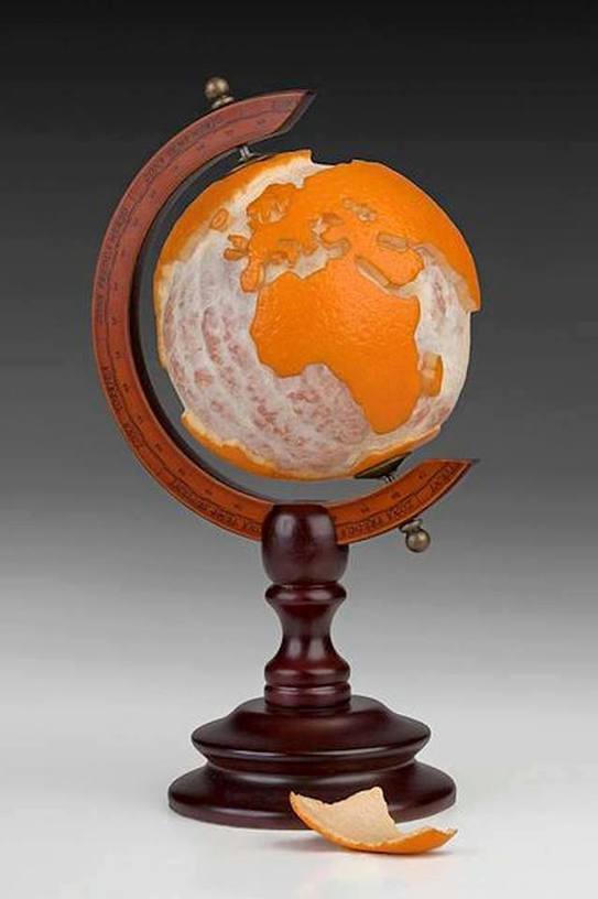 I have used an “apple globe” is the past to symbolize geography education and enjoy this play playful artistic work. Oranges have been used to help students understand map distortion and well as map projections, so I thought this artistic rendering would be a nice fun addition to the set.
