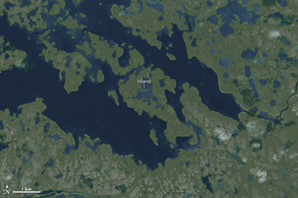 On August 21, 2014, the Operational Land Imager (OLI) on Landsat 8 captured this natural-color view of the “sub-sub-sub-island.” The top image shows a close-up view of the unnamed island, while the bottom image shows a wider view of Victoria Island’s lake-littered landscape (download large image here).”