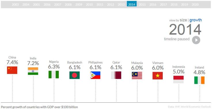 This interactive is simple but conveys some very powerful data. Above is a still shot of 2014’s fastest growing economies (you can also view the largest overall economies). Another telling statistical ranking is the UN’s Human Development Index; explore more global data on Google’s Public Data.