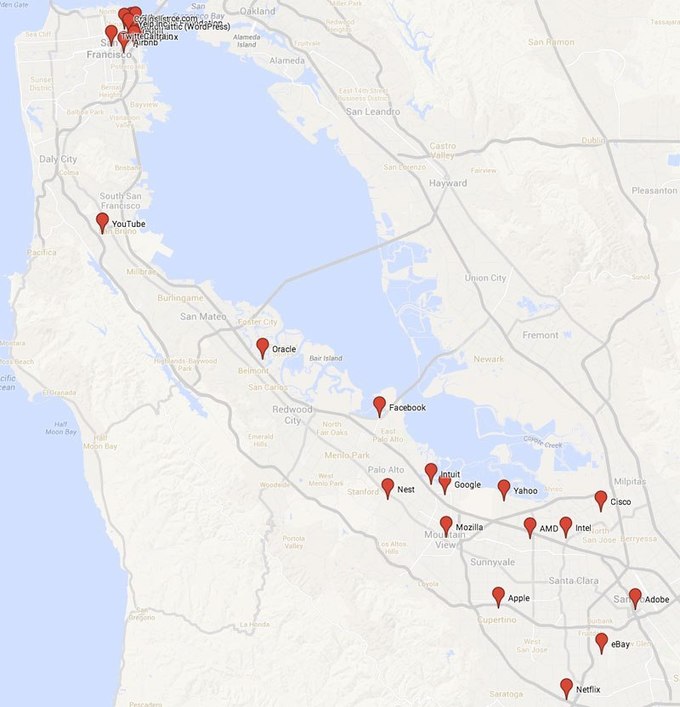 Some of these maps are more compellling than others (like all lists like this) but some are really telling. The map above shows the dense concentration of tech corporate headquarters in Silicon Valley/San Francisco.