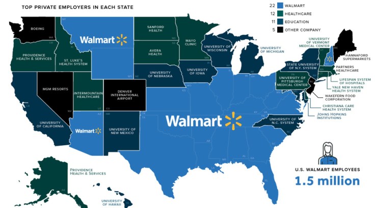 Walmart employs 1.5 million people across the country – and the retail behemoth is now the largest private employer in 22 states.