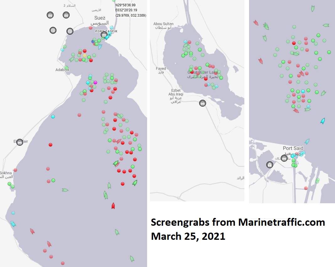 Below, is a video that shows the inauguration of the 2015 expansion of the Suez Canal. This gives some solid context for the importance of the Suez Canal. Completed in 1869, with the new expansion the canal is over 200 meters wide and 24 meters deep. This was made to accommodate the largest of the ocean-going vessels, which when turned sideways (as we have learned in this incident) can be over 400 meters and block the entire canal.