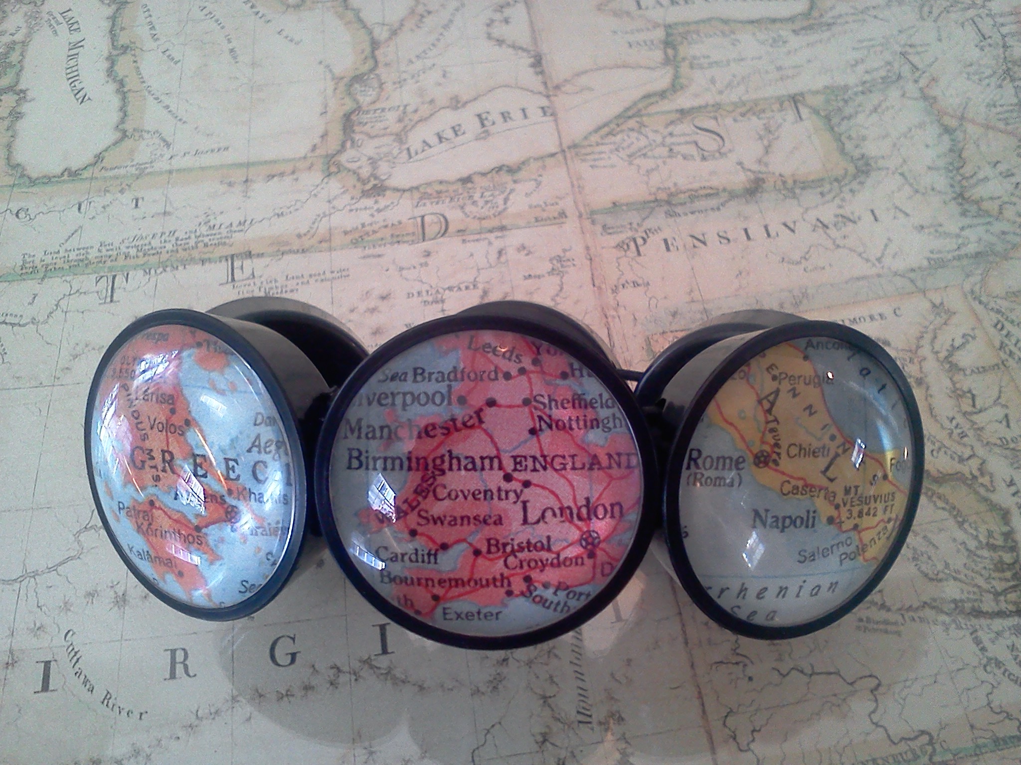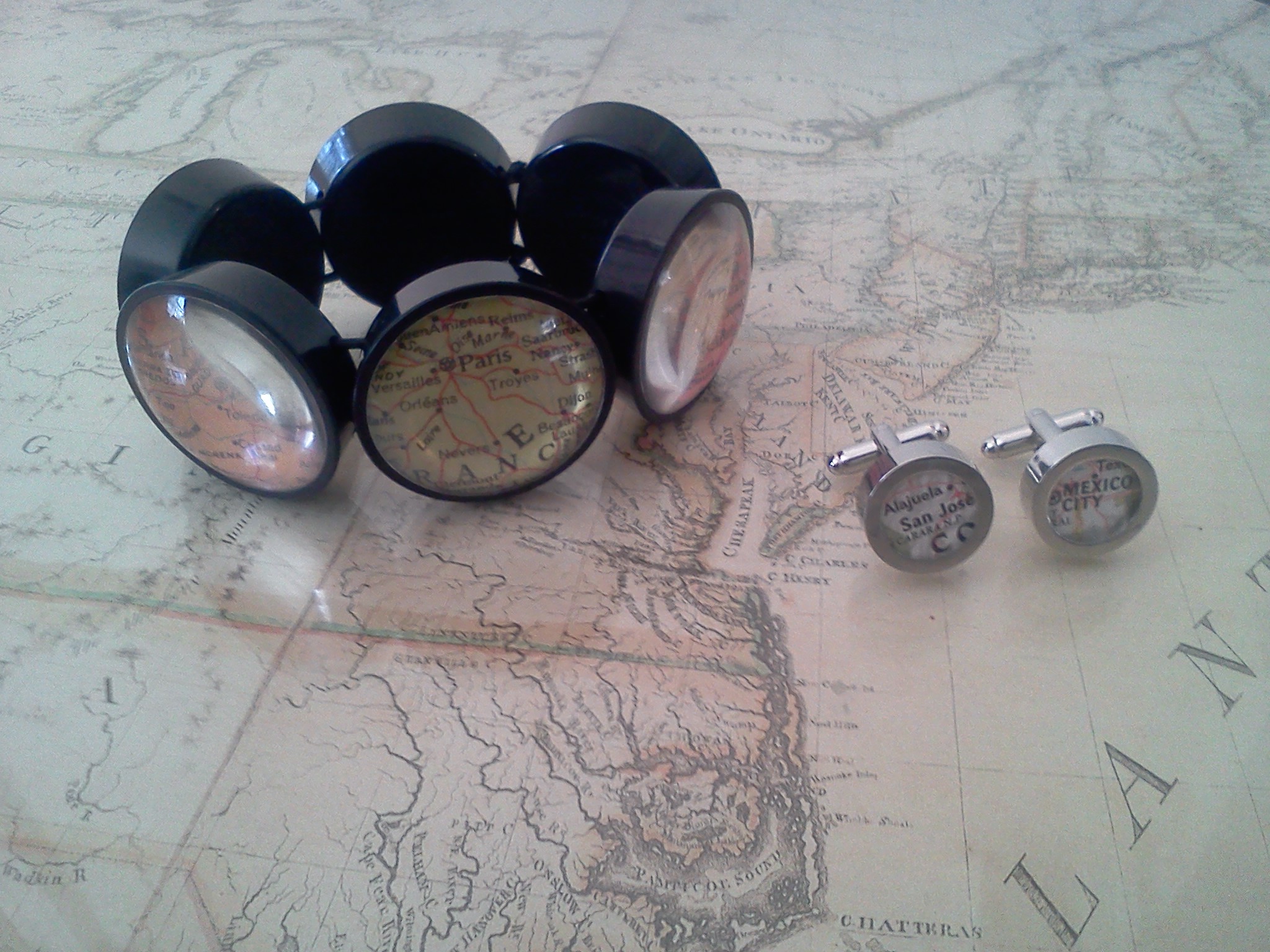 These cuff links are easily customized, and can be purchased at Annie Howes (maps not included). The background in these pictures is this cartographic end table in my living room that my amazingly talented wife also made. Remembering that some great memories that we share together are connected to places that we’ve been together on vacations, I wanted to get a Valentine’s Day gift that evoked these places. When I hear of this bracelet (I can’t take the credit for making this–in fact, she told me that she saw it, so I really don’t get too much credit for being creative), I knew I found something that she would love (made by Hotcakes Design, sold here).