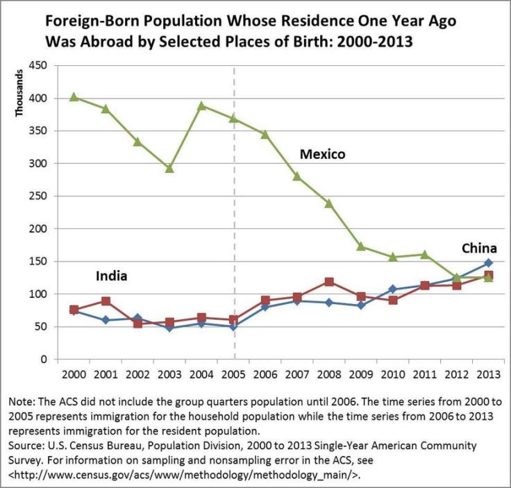 “In 2013, China replaced Mexico as the top sending country for immigrants to the United States. This followed a decade where immigration from China and India increased while immigration from Mexico decreased.”
