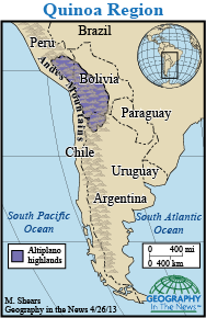 This map from a Geography in the News article shows that Quinoa has historically been grown almost exclusively in the highlands of the Andes Mountains. This was a localized food source for generations but this new global demand has increased the economic possibilities for Quinoa growers. At the same time, local consumers that have traditionally depended on cheap Quinoa to supplement their diet are now effectively priced out, as stated in this Al-Jazeera article.