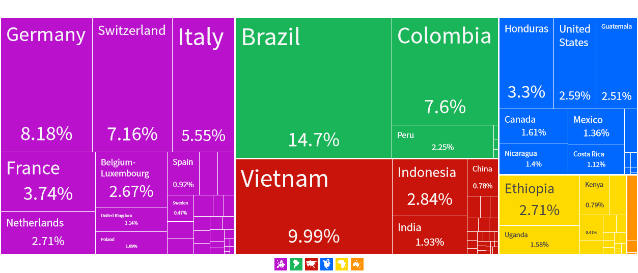 While I was wondering about the world largest coffee exporters, I looked at the Observatory of Economic Complexity’s data visualization tools. I was expecting to find mostly tropical countries where coffee is grown. I was baffled to find that Germany was listed as a major coffee exporter, along with many other Western European countries.