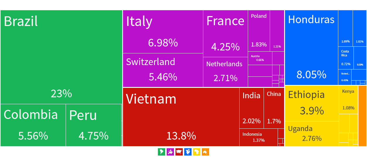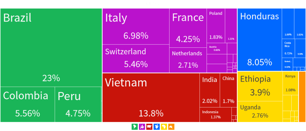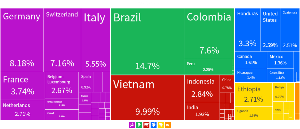 This at first seemed like a misprint but many European countries like Germany import import green coffee beans from a variety of tropical countries, so they are a major producer of coffee without growing a single bean. In fact, the world’s largest single port for shipping coffee is Hamburg.