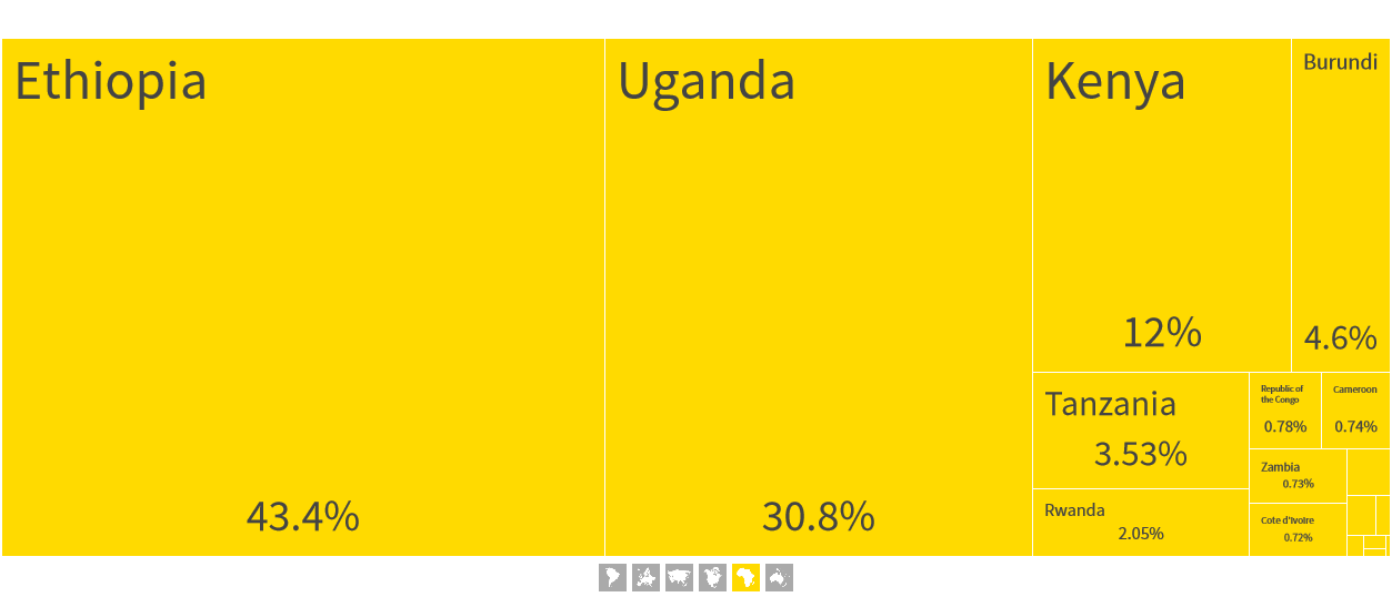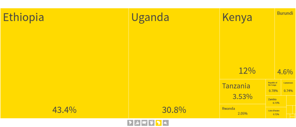 The highlands of East Africa were the original hearth of coffee beans and today, countries like Ethiopia and Uganda export green coffee beans overwhelmingly to European countries which in turn, roasts them and then exports them internationally.