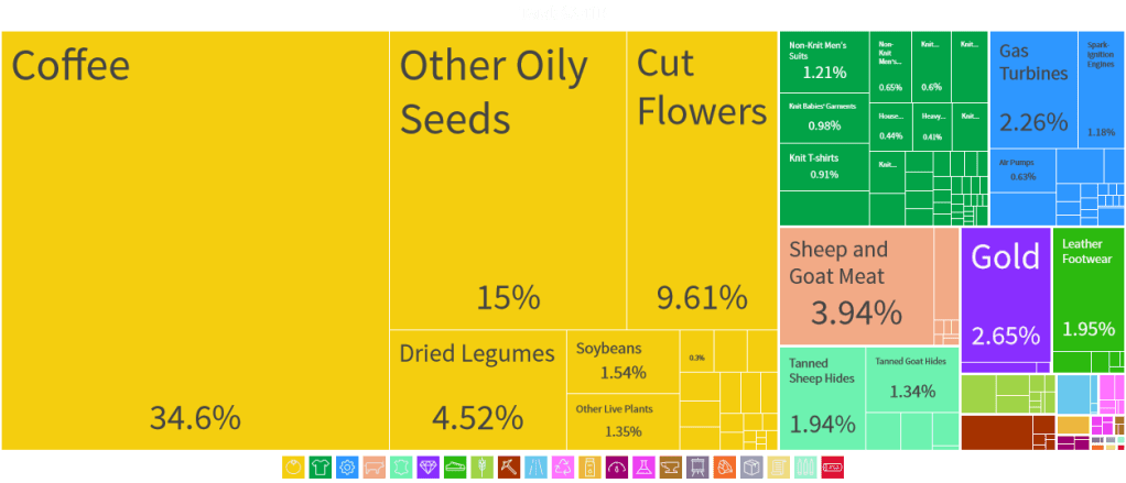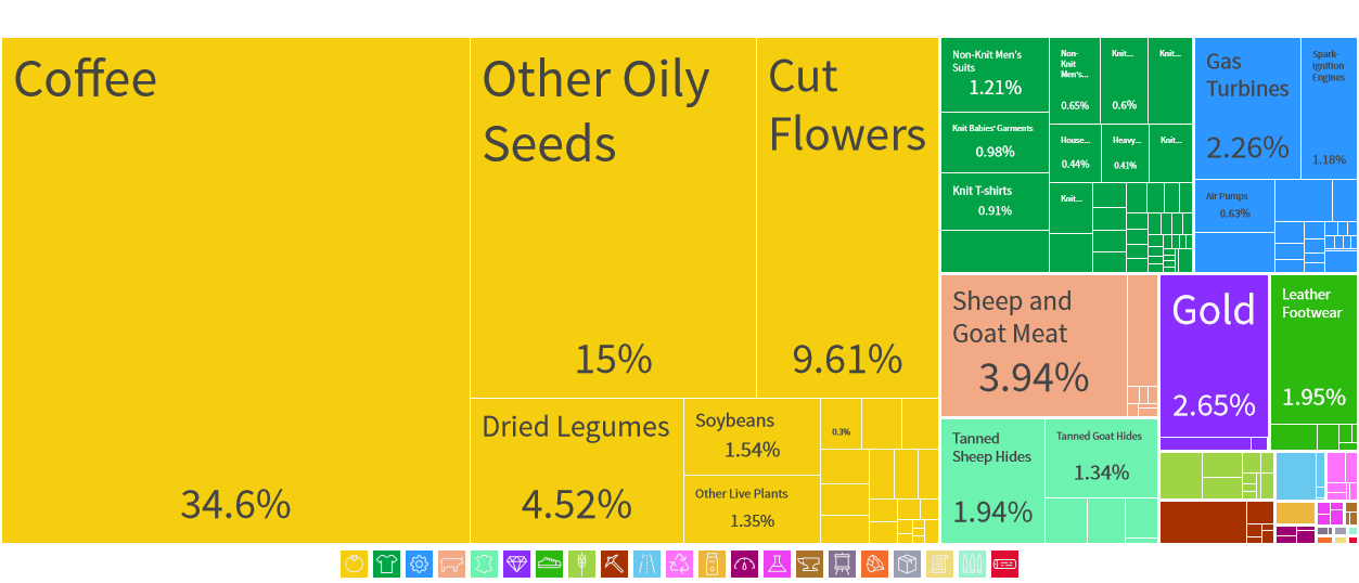 Exporting the finalized roasted coffee is but a very small part the overall German economy (the largest of the light green boxes-0.26% of total exports). For Ethiopia however, coffee exports is a major component of all their international trade (34.6%). Ethiopia produces something of high value, but is not positioned to extract a lot of profit from that commodity.