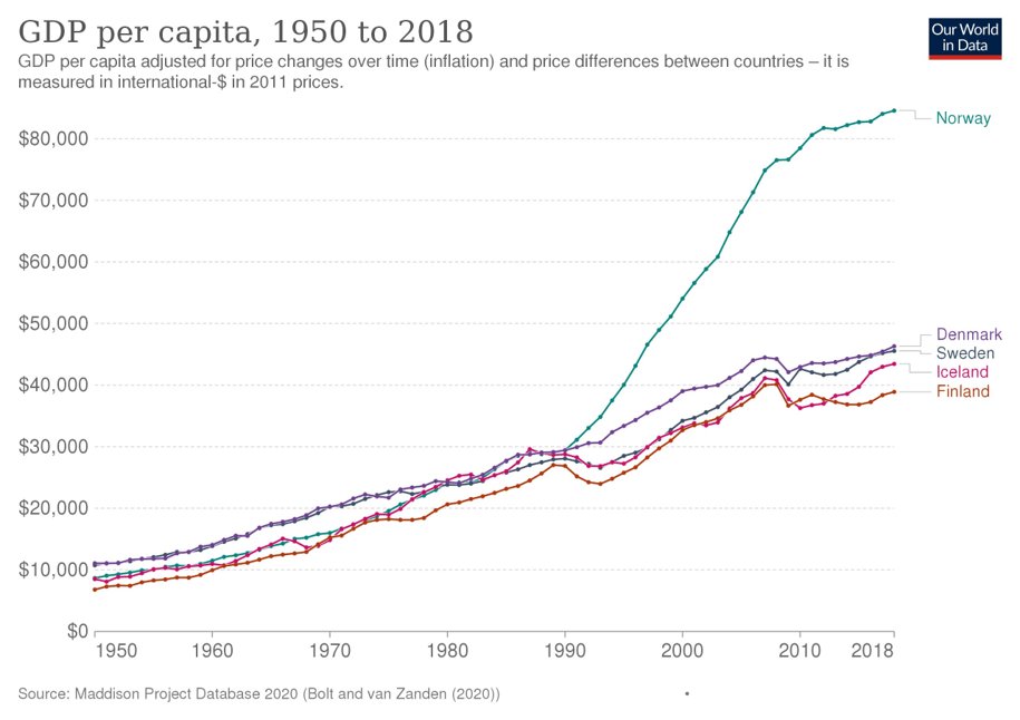 The 1969 discovering of oil in the North Sea was the obvious answer to their economic growth. The overlooked aspect is the low levels of corruption, sound public policy for future economic success, and democratic institutions that were already deeply entrenched in Norway. Many oil-rich countries have squandered the wealth being incentivized for short-term spending at best, with politicians siphoning off the money at worse. Timing can matter tremendously; Norway was developed first, THEN discovered oil in 1969. That means that the already solid institutions were the ones to shepherd in their enormous success.