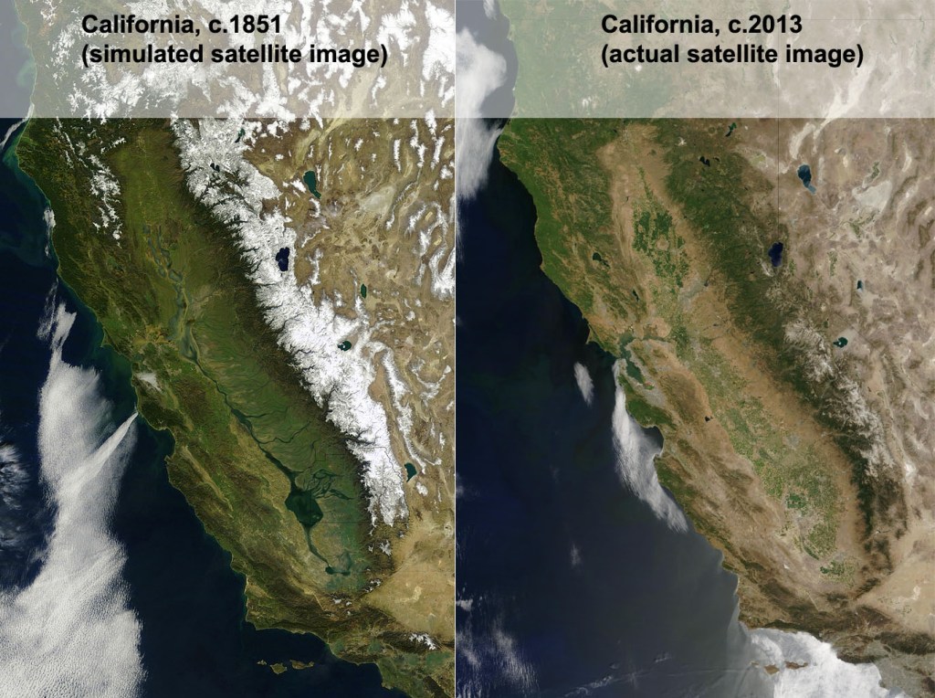 A few years ago, I was delighted to see an geographer’s rendition of what a satellite image of California would have looked if such a thing existed in the 1800s (figure 1). Back then the southern San Joaquin Valley was swampy wetland surrounding Lake Tulare, the largest freshwater lake west of the Mississippi River. In the late 1800s, canals and dams were created to divert water from the rivers that fed into the lake to go supporting agriculture and the metropolitan areas of California. As the very shallow lake dried up, the lakebed was converted into was converted to agricultural land, mainly under cotton cultivation.
