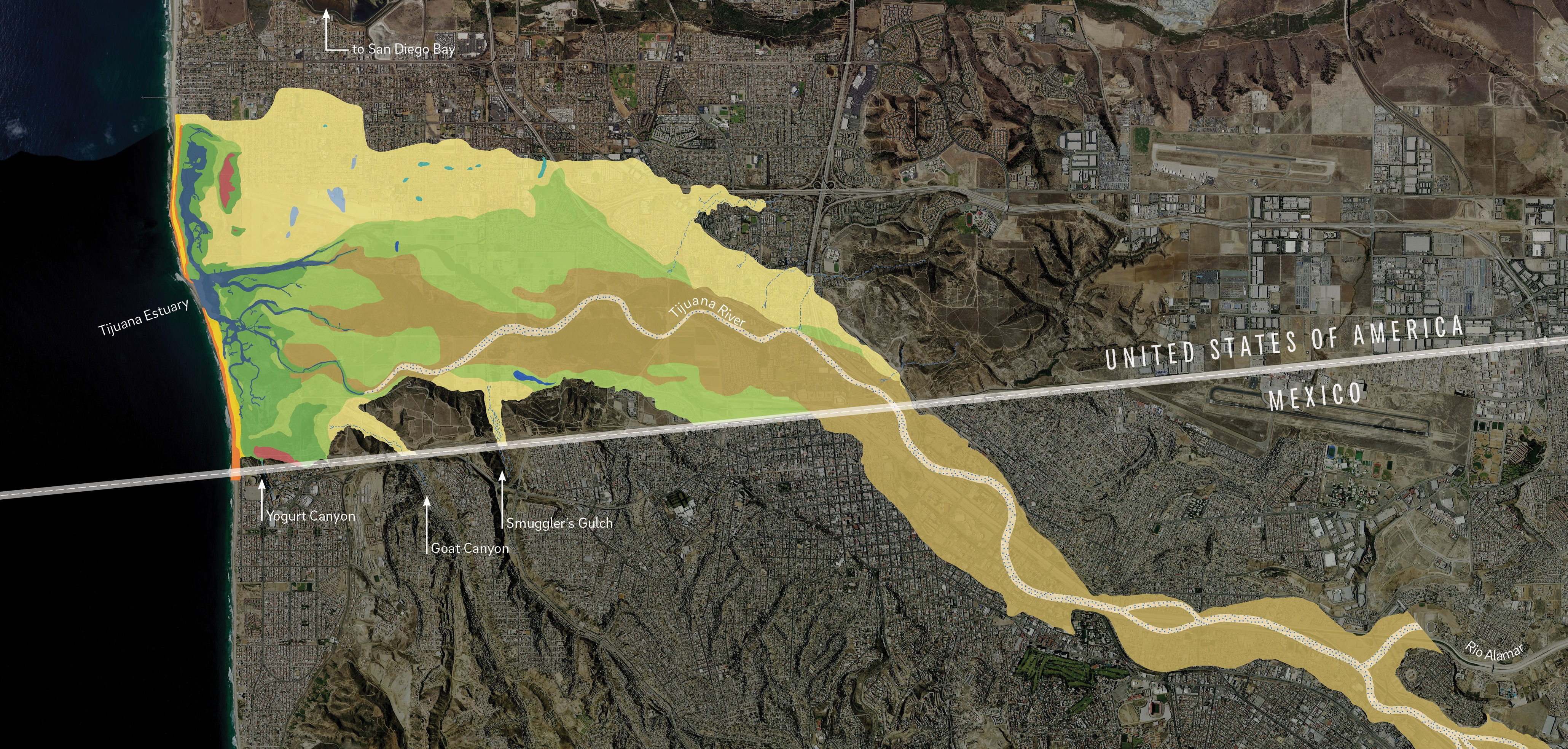 INTERNATIONAL CONTEXT: The Tijuana River flows through downtown Tijuana and crosses the U.S. border before emptying into the Pacific Ocean. The river is heavily industrialized in Mexico with pollutants and sewage from the major urban area of Tijuana, but the river is treated as a wetlands wilderness preserve in the once it crosses into the United States (downstream of the pollutants).