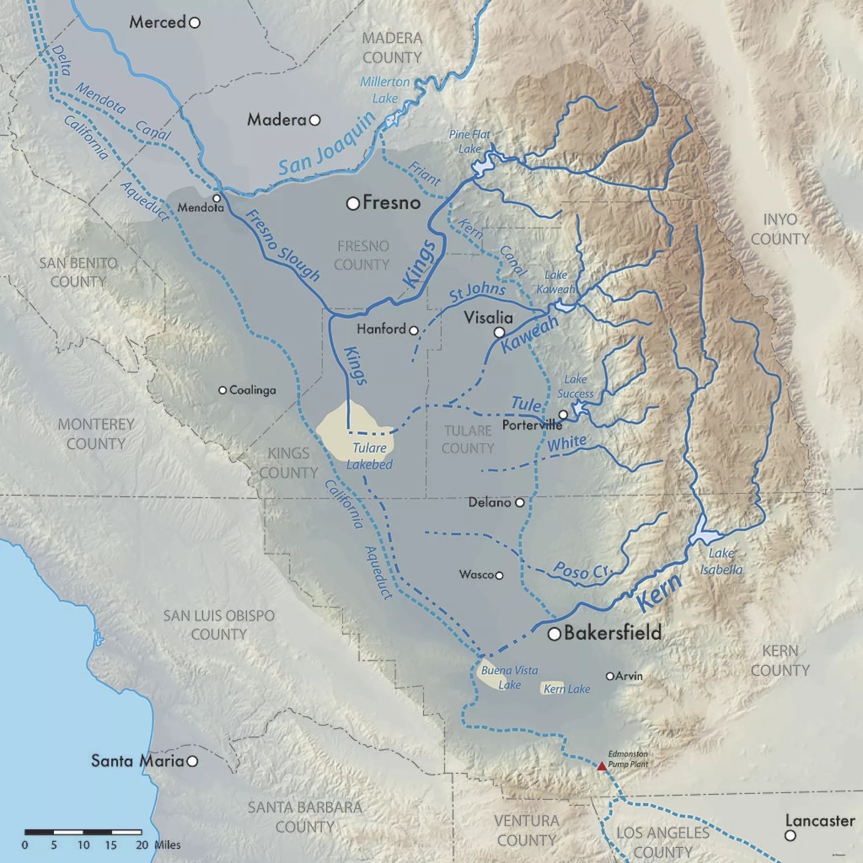 A few years ago, I was delighted to see an geographer’s rendition of what a satellite image of California would have looked if such a thing existed in the 1800s (figure 1). Back then the southern San Joaquin Valley was swampy wetland surrounding Lake Tulare, the largest freshwater lake west of the Mississippi River. In the late 1800s, canals and dams were created to divert water from the rivers that fed into the lake to go supporting agriculture and the metropolitan areas of California. As the very shallow lake dried up, the lakebed was converted into was converted to agricultural land, mainly under cotton cultivation.