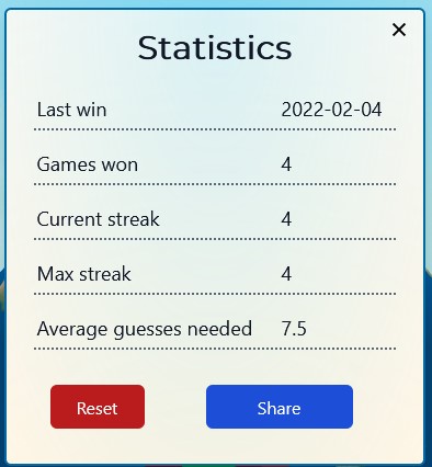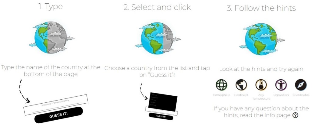 COUNTRYLE recap: This is the one that relies most on geographic information since the hints are focus on real data. You guess any country, and the hints will tell you if the actual mystery country has a larger or smaller population, a warmer or colder climate…so that is the guesses aren’t just based on luck or hunches, but some evaluation.