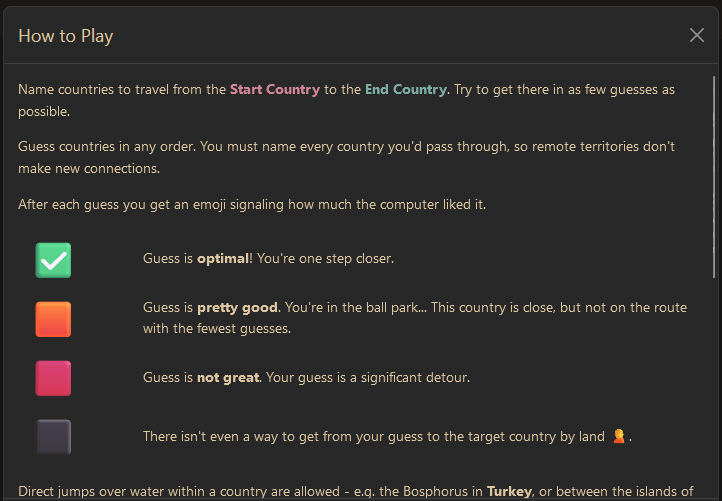 TRAVLE recap: Travle names two random countries, and you have to draw the most direct land route between the countries with the goal of minimizing the number of states, not essentially the miles.