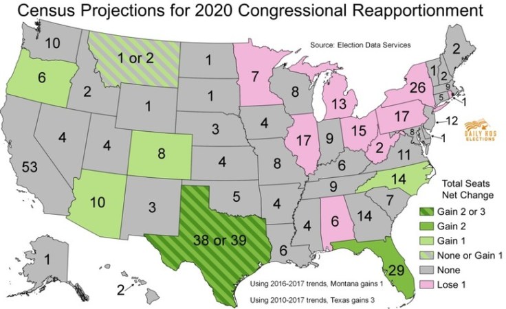 the Census Bureau released its population estimates for 2017 for every state, detailing how many residents each state has gained or lost since the 2010 census. The firm Election Data Services has used these estimates to project how many congressional seats each state might gain or lose in the 2020 round of reapportionment, which assigns each state its share of the House’s 435 districts based on its population.